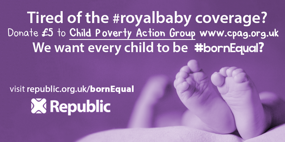 A woman named Kate Middleton gave birth to a baby boy this morning, her husband William was by her bedside. It's their third child. As the BBC continues its sycophantic fawning and it takes over the news agenda to divert attention from Windrush and Syria. Here's a really positive way to respond to the Royal Baby news. Donate to the Child Poverty Action Group.